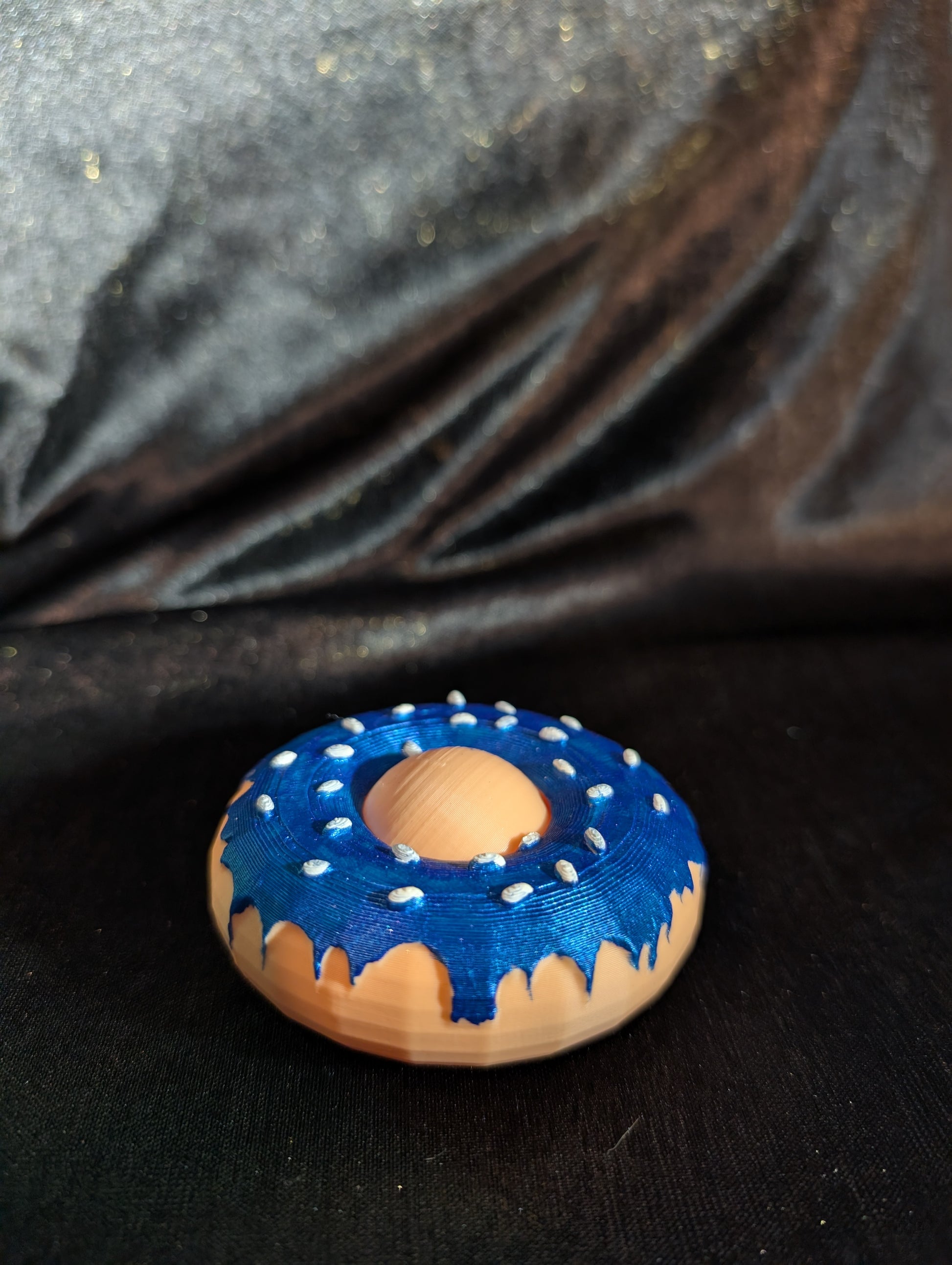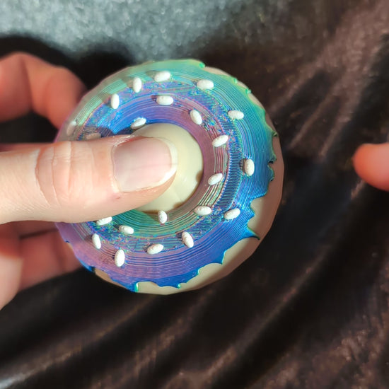 Donut spinner fidget of our design. Printed in PLA, painted with acrylic. Perfect for hands of all sizes with a diameter of 2.7 inches. Available in several colors